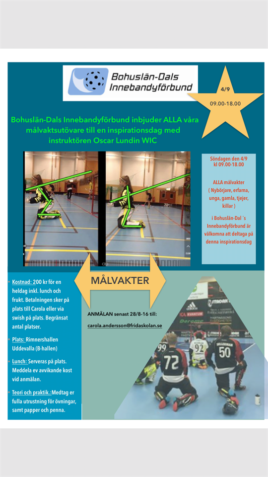 Bohuslän-Dals Innebandyförbund anordnar en målvaktspar den 4/9 kl.09:00-18:00 i Rimnershallen, Uddevalla. Anmälan senast 28/8 till: carola.andersson@fridaskolan.se Myggenäs IBK 28 jun 2016 0kommentarer