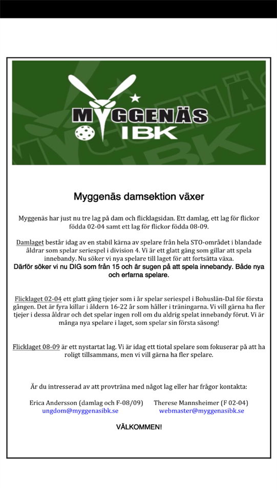I dagarna kommer följande information läggas ut på NyheterSTO. Vi hoppas det ska leda till fler damer och flickor inom innebandyn. Myggenäs IBK 24 feb 2016 0kommentarer